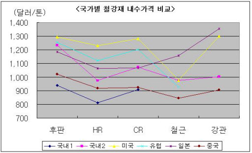 우리나라와 주요국을 대상으로 주요 철강제품의 내수 가격(공장도 기준, 일부 유통가격 기준)을 조사한 결과, 전체적으로 판재류는 세계에서 가장 낮은 것으로 나타났다. 봉형강류 및 강관의 경우에는 중국보다는 높고 미국, 일본 등에 비해서는 저렴한 것으로 조사됐다.