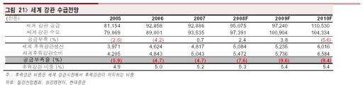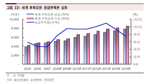 현대증권은 "세계 후육강관 시장은 최근 3년간 지속적인 공급부족 상태에 있다"며 " 2008년과 2009년에는 각각 8%, 10% 공급부족을 기록할 것으로 전망되며, 2013년까지 후육강관의 공급부족은 심화될 것이다"고 예상했다.