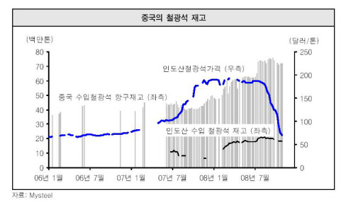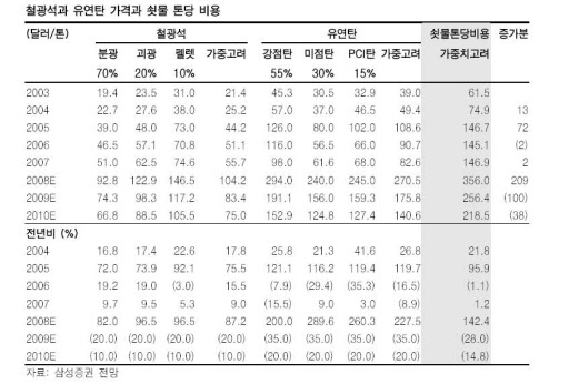 삼성증권의 2009년 철강전망에 따르면 08년에 철광석 계약가격은 87% 상승하고, 유연탄 가격은 117% 인상되었다. 그러나, 09년에는 철강생산감소와 꾸준한 광산투자, 그동안 미국달러대비 강세를 보였던 자원국의 화페가치 하락, 중국의 철광석재고 증가와 자연재해에서 벗어난 호주광산업체들의 원활한 생산 등으로 09년에는 각각 20%, 35% 하락할 것으로 보인다. 이에 따라, 08년에 평균 142%, 209달러 인상된 톤당 쇳물당 원재료원가가 09년에 평균 28%, 100달러 하락할 것으로 보인다.