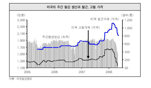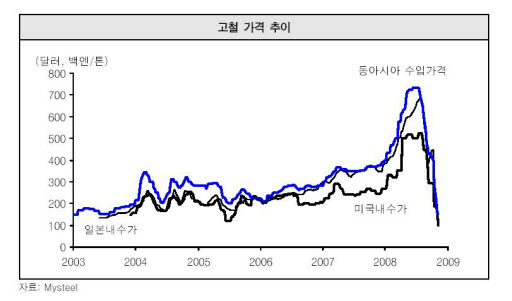 국내 철근가격은 11월에 톤당 10만원 인하되었다. 하지만, 추가적인 가격인하가 이어질 것으로 보인다. 왜냐하면, 수입고철가격은 2분기 700달러에서 100달러대로 하락하고, 국내 고철가격도 70만원에서 20만원대로 하락하였기 때문이다. 고철가격의 하락은 금융위기에 따른 전세계적인 투자활동위축과 철강업체들의 감산으로 수요감소에다가 가격강세를 보인 08년 상반기 축적해 놓은 높은 재고 부담 때문이다. 09년 하반기에 가서야 각국의 경기부양책으로 상반기 경기부진에서 벗어나면서 고철가격은 반등을 보이면서 철근가격도 회복세를 보일 전망이다. 09년 봄에 재고조정에 따른 성수기 가동률 상승으로 일시적인 고철가격반등에 따른 철강가격반등도 예상된다.