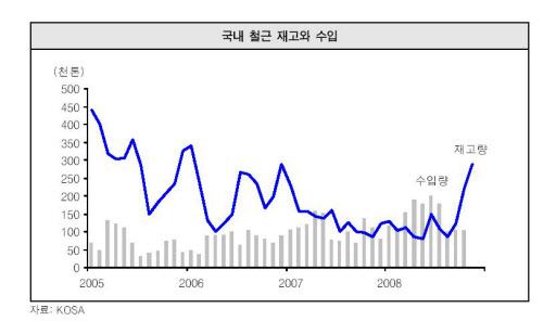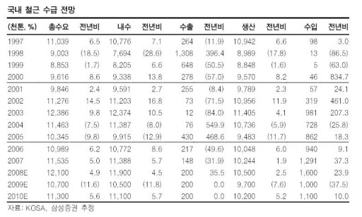 삼성증권의 2009년 철강전망에 따르면 국내 철근수요는 08년에는 07년 건설사들의 밀어내기 아파트분양영향으로 4.5% 증가후, 09년에국내 금융위기와 건설사들의 취약한 재무구조 등에 따른 건설사들의 분양 부진으로 12% 감소할 것으로 보인다. 특히 09년도 상반기가 매우 부진할 것으로 보인다. 10년에는 정부의 경기활성화정책 등으로 09년 부진에서 벗어나 6% 늘어날 것으로 보인다. 철근업체들의 생산은 09년에 7.6% 감소할 것으로 보인다. 수입이 38% 감소할 것으로 보여 생산감소폭은 수요감소폭보다는 작을 전망이다. 중국의 밀어내기식 수출가능성을 배제할 수 없으나, 수입감소전망은 국내 수요부진에다가 국내 철근 업체들의 철근가격인하로 수입 견제, 철근 생산하는 중국중소고로업체들의 도산, 09년 3월부터 적용되는 건설기술관리법개정으로 중국산 철근 수요 둔화 (일정 규모이상건설에는 KS 규격이거나 이에 준하는 인증제품을 사용해야 함)가 전망되기 때문이다.