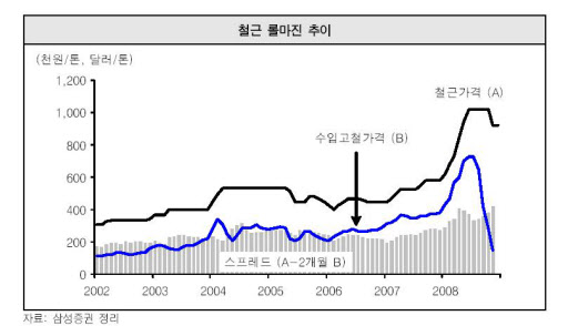 과거와는 달리 철근가격하락이 고철가격하락 속도보다는 느려 톤당 스프레드는 안정적이다. 즉 과거 불황기와는 달리 높은 재고부담으로 인한 재고 평가성 손실이 작을 것으로 보인다. 물론, 이러한 안정적인 스프레드는 판매량감소에 따른 고정비부담증가를 상쇄시키면서 전체적인 수익성은 과거 적자를 보인 불황기와는 다르게 어느 정도 유지될 것으로 보인다.