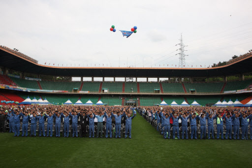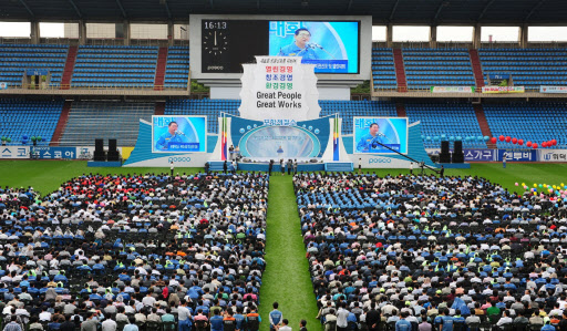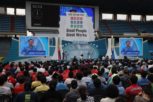 10일 포항스틸야드 축구 전용구장에서 정준양 회장을 비롯한 포항제철소, 계열사, 외주파트너사 임직원 4000여명이 참석한 가운데 “포항제철소 비전 선포식 및 CEO와의 열린 대화” 행사에서 새롭게 정립한 “Great People, Great Works!!”라는 비전 선포를 통해 좋은 제철소를 넘어 위대한 제철소로, 세계가 놀라고 세계인이 감동하는 제철소를 만들어 가기 위한 힘찬 미래를 열어 갈 것을 다짐한다.