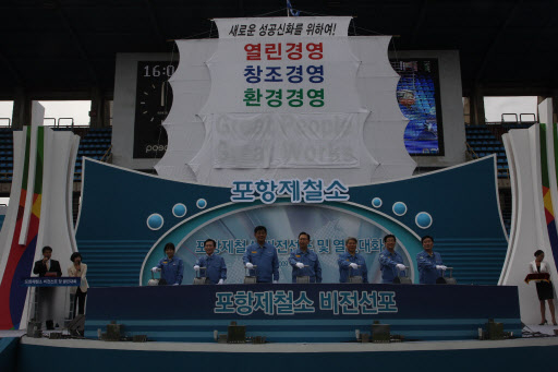 포항제철소 모든 가족의 꿈을 실은 “Great People, Great Works!!” 라는 비전 선포식을 갖고 참가자 전원이 새롭게 제정된 비전 구호를 힘차게 제창한다. 비전 선포식에 이어 행사에 참석한 정준양 회장은 격려사에서 “열린경영, 창조경영, 환경경영 이념을 바탕으로 회사 구성원 전체가 같은 방향으로 함께 나아가야 하며 이번 비전 선포를 계기로 포항제철소가 한 단계 업그레이드 되고 기술력이나 조직문화 등 모든 면에서 세계에서 가장 경쟁력 있고 가장 행복한 제철소가 되기를 간절히 바란다”며 그 꿈을 반드시 이뤄 줄 것을 당부했다.