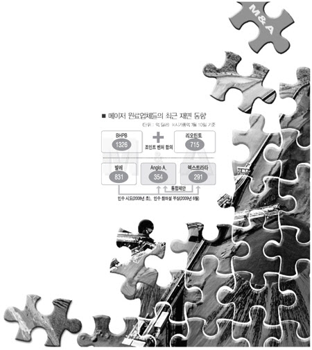 최근 BHP빌리튼과 리오틴토의 조인트 벤처(JV) 합의가 메이저 원료업체의 재편을 촉발하고 있는데, 그동안 공격적인 인수·합병을 추진하는 과정에서 금융비용이 증가하고 수익성이 악화돼 유동성 위기에 처한 메이저 원료업체들이 구조개편의 대상이 되고 있다. 예컨대 리오틴토는 알칸 인수 이후 부채가 급증했고, 세계 2위 원료탄 수출업체인 테크 리소시스도 인수 차입금 증가 등으로 신용등급이 하락했다. 또한 글로벌 경제위기로 인해 원료업체들의 시장가치가 대폭 하락해 인수 부담이 줄어든 것도 재편을 촉진하는 요인이 되고 있다.