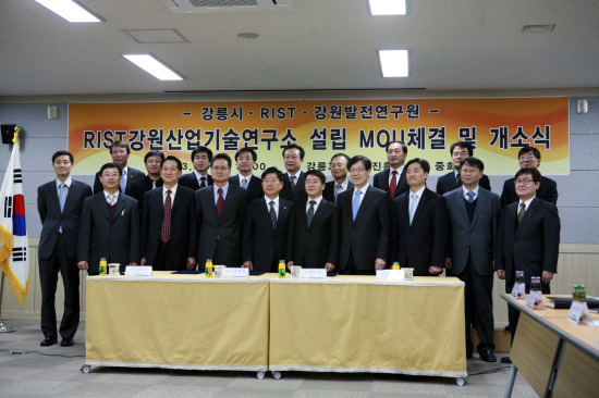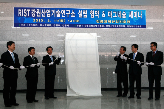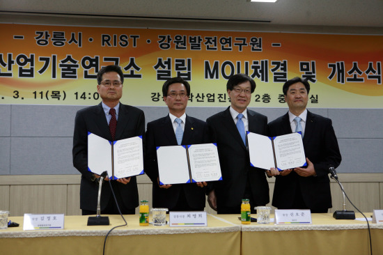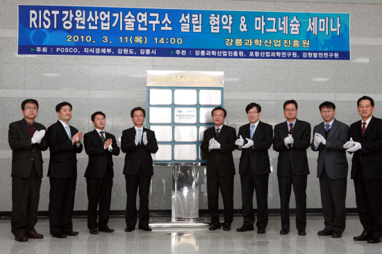 강릉시와 포항산업과학연구원, 강원발전연구원은 강릉시에 건립하는 마그네슘 제련소의 기술개발과 연관산업 R&D를 위하여 '포항산업과학연구원(RIST) 강원산업기술연구소'를 강릉시에 설치하는 양해각서(MOU)를 11일 오후 2시 강릉과학산업진흥원에서 체결하고, 개소 현판식을 거행했다.