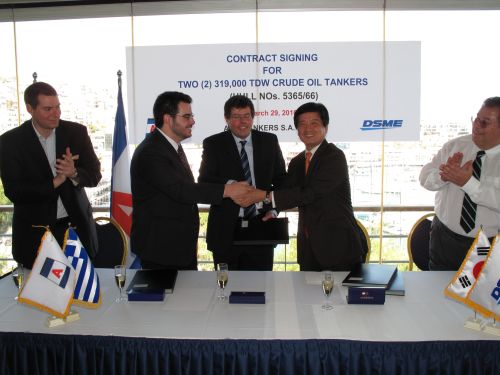 ▲ 대우조선해양과 알미사는 지난 29일(현지시간) 그리스 아테네에서 초대형유조선 2쳑에 대한 계약 서명식을 가졌다.