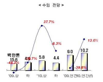 반면, 수입은 국내 공급능력 확대, 환율요인 등이 겹치면서 감소할 것으로 예상된다. 특히 건설경기가 상당히 위축되어 있어 철근, 형강을 중심으로 수입량이 줄어들 것으로 점쳐진다. 국내 공급능력이 증가한 중후판, 열연코일 등도 감소를 면치 못할 것으로 보인다.