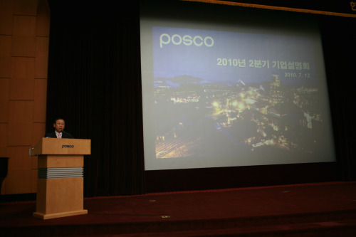 ▲ 13일 여의도 KRX에서 열린 '포스코 2010년 2분기 기업설명회'에서 최종태 포스코 사장이 브리핑을 하고 있다.