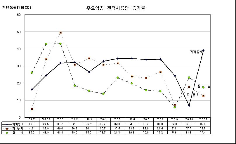 11월 산업용 판매량은 기계장비(39%), 철강(17.4%), 자동차(12.7%), 반도체(12.5%) 등 전력다소비 업종에서 높은 증가세를 보였다. 업종별 증감률은 기계장비 39.0 자동차 12.7, 철강 17.4, 조립금속 11.1, 화학제품 3.3, 반도체 12.5, 석유정제 5.1, 섬유 5.0, 펄프종이 1.9, 조선 3.4를 기록했다.