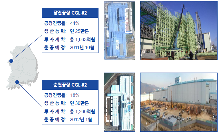 현대하이스코 당진공장 CGL#2가 오는 10월 준공에 들어갈 예정이다. 현재 공정 진행율은 44%이며 연간생산능력 25만톤, 총 1,063억원을 투자할 계획이다. 더불어 순천공장 CGL#2는 2012년 1월 준공할 것으로 연산능력은 30만톤, 투자금액은 총 1,260억원이 소요될 예정이다