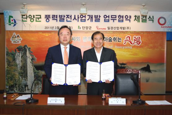 일경산업개발(회장 김형일)이 단양군과 20MW급 용량의 풍력발전단지 조성을 위한 MOU를 21일 체결했다고 밝혔다.
