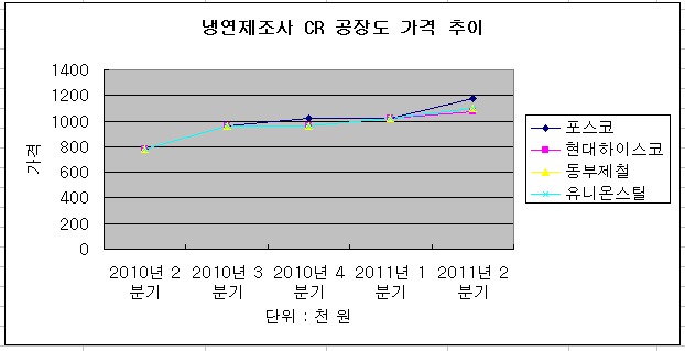 2009년 4분기부터 2010년 2분기까지 냉연강판(CR) 공장도 가격은 톤당 78만5,000원을 유지, 포스코가 2010년 4월, 3분기 가격을 톤당 96만5,000원으로 인상할 것으로 결정하면서 냉연제조3사 공장도 가격도 동일한 가격대로 조정됐다.