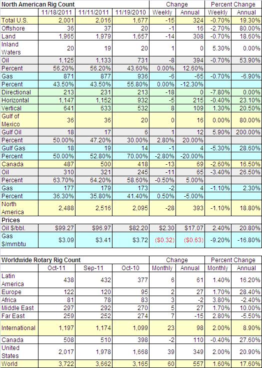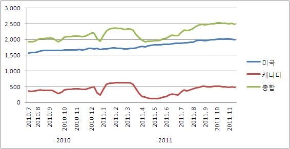 석유컨설팅 회사인 베이커 휴즈에 따르면 11월 셋째 주 북미지역(미국·캐나다)의 리그 가동수가 전주 대비 28기 감소한 2,488기를 기록했다.