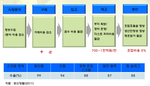 또한 구매-검수-관리 비용 절감을 통해 2차 오염을 방지해야 할 수 있고, 생산의 안정성과 계획성을 제고해 용강 원가를 낮출 수 있다고 밝혔다. 이는 철스크랩 장입 구조를 최적화 하는 것은 물론 제철소 안전 생산을 가능하게 해 조업 생산성을 개선하는 데에도 도움이 될 것으로 기대됐다. 이와 함께 고합금 철스크랩 회수를 통해 원료 구매 비용을 절감할 수 있을 것으로 예상됐다.