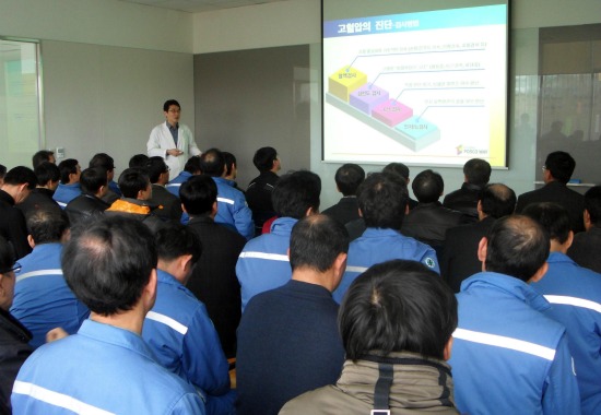 ▲ 포스코가 최근 포항에 소재한 포스코 글로벌안전센터에서 제1회 포스코 안전포럼을 개최해 안전문화를 전파하는 자리를 마련했다. 사진은 안전포럼 기간 중 진행된 건강강좌의 모습