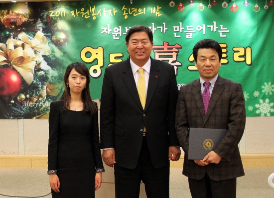 △ 포스코P&S는 영등포구가 선정한 ‘2011년도 우수 자원봉사단체’로 선정되어 표창장을 수상했다. 사진은 왼쪽부터 지속경영그룹 김희선 주무(봉사활동 담당자), 조길형 영등포구청장, 혁신정보그룹 박은호 부관리직(직장발전협의회 직원측 대표).