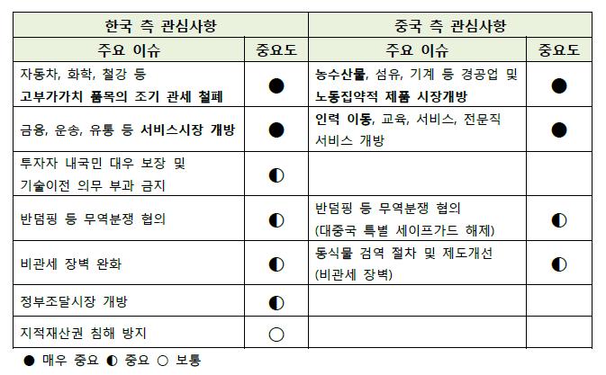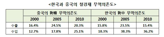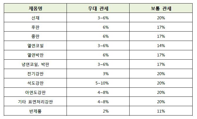 우선 언급된 것은 중국의 ‘철강관세 조기 철폐’ 여부이다. 현재 무관세 정책을 펼치고 있는 우리나라와 달리 중국은 철강 제품에 평균 5%의 수입관세를 부과하고 있어 한-중 FTA 협상에서는 중국 철강관세를 최단시간 내에 철폐하는 것이 무엇보다 중요한 사안이다.