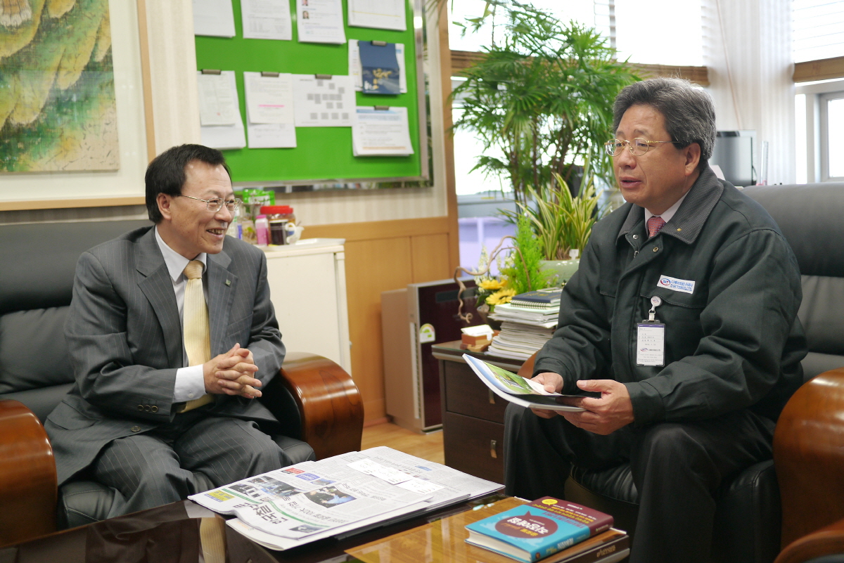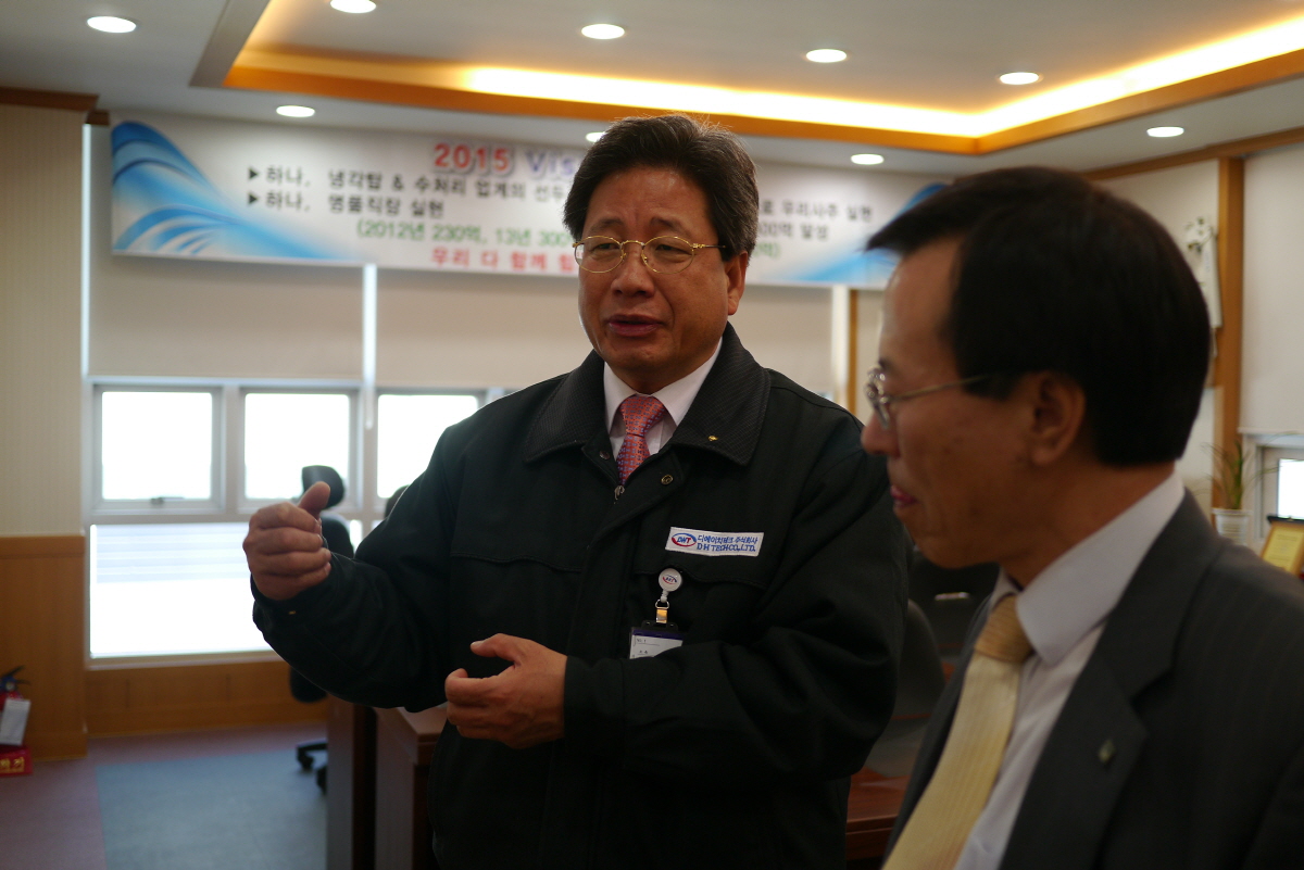 5일 本紙 송재봉 사장(편집인) 이 방문한 자리에서 디에이치테크 황소용 사장이 자사에서 제작하고 있는 냉각탑과 수처리 설비에 대한 기술력을 뽐냈다.