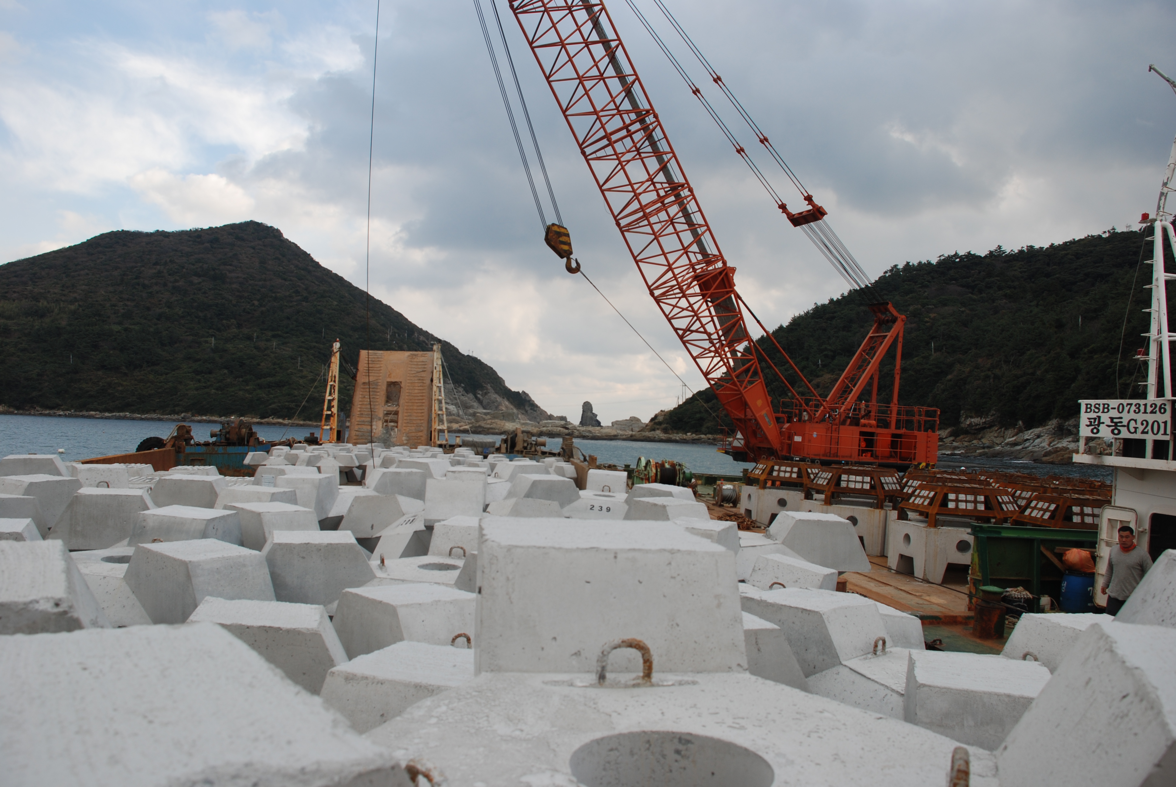 △ 여수 거문도 앞바다에 설치된 슬래그를 활용해 제작한 인공어초 '트리톤'의 모습. 광합성과 단백질 합성에 필수 요소인 칼슘과 철의 함량이 일반 자연 골재보다 높고 재질 특성 상 해조류의 초기 부착과 생육이 매우 우수해 바다 생물에게 최적의 생육 조건을 제공한다. |