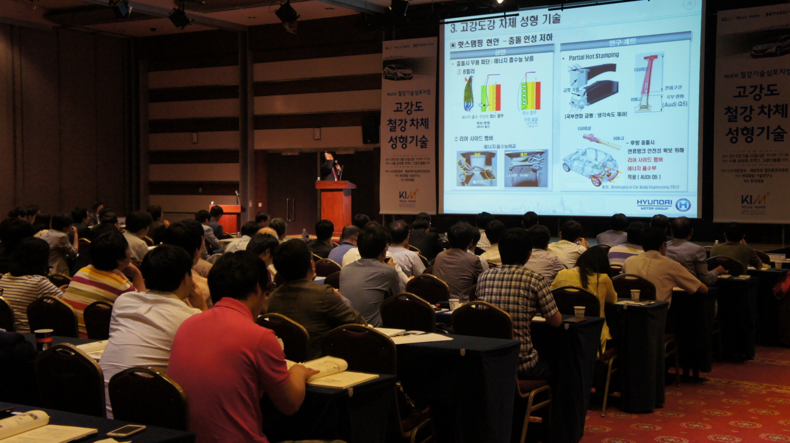 현대제철 기술연구소장인 조원석 부사장의 개회사를 시작으로 진행된 오전 세션에서는 고강도 철강차체 성형기술 전략에 대해 현대제철 한종만 이사와 현대자동차 김중한 센터장, 포스코 남재복 그룹리더가 강연했다.
