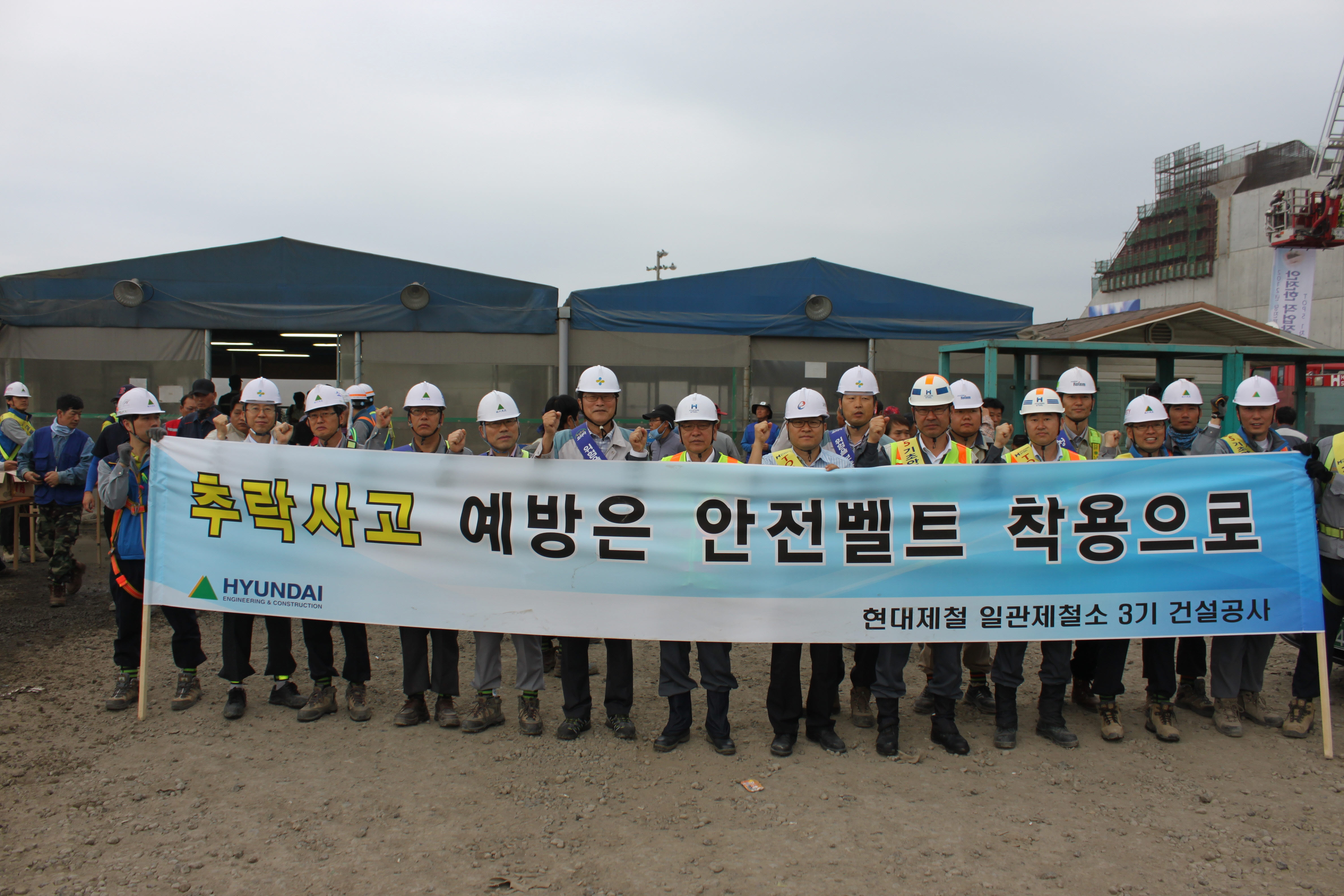 현대제철(부회장 박승하)이 당진 공장 서문 입구에서 5일 고로 3기 건설공사 안전캠페인을 가졌다.