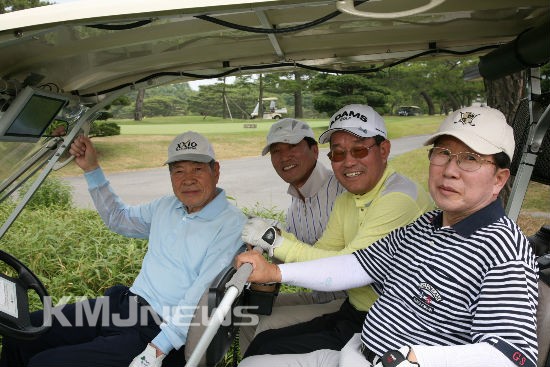 ▲ C팀 4조 1번홀 티샷 후 이동 전 카트에서 한 컷. (사진 왼쪽부터) 배무남 전 동부제철 부사장. 정은영 한국철강자원협회 회장, 이태준 고려제강 부사장, 김용운 전 포스코 부사장.