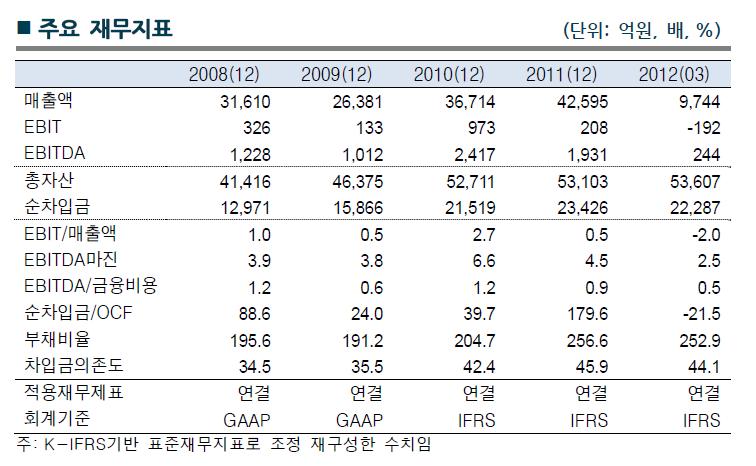 또한 전기로 투자로 인한 대규모의 자본적 지출로 차입규모가 증가하면서 2012 년 3 월말 개별/별도 기준 순차입금은 2조1천억원을 상회하고 있으며, 이로 인한 금융비용 증가추이가 동부제철의 수익성에 적지않은 부담요인으로 작용하는 등 현금창출력 대비 과중한 차입부담이 동부제철의 신용도를 제약하는 주 요인으로 꼽았다.