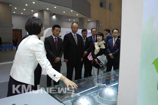 ▲ 현대하이스코 신성재 사장, 현대제철 우유철 사장, 기보스틸 최승옥 사장(앞줄 왼쪽부터)이 현대제철 밀폐형 원료돔 모형을 살펴보고 있다.
