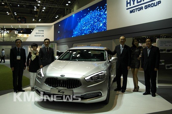 ▲ 현대제철 우유철 사장과 현대하이스코 신성재 사장이 최고급 세단 K9 앞에서 기념 촬영을 했다.