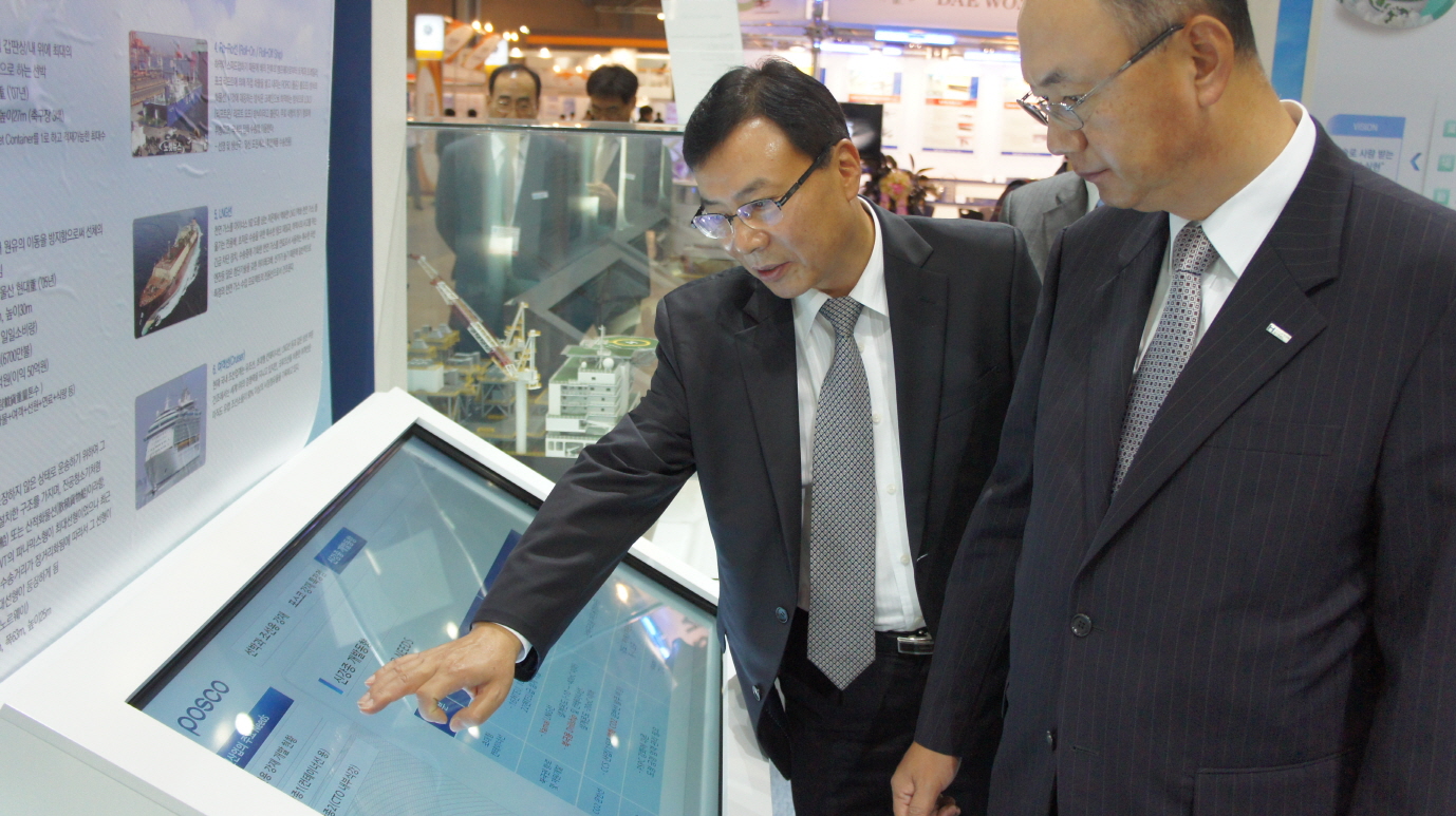 우선 우유철 사장은 포스코의 조선해양용 강재에 대해 상당한 관심을 표했다. 설치된 영상물과 전시자료를 꼼꼼히 살펴 후판에 대한 관심사항을 그대로 드러냈다.