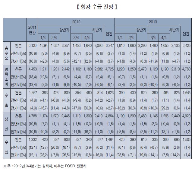 포스리는 올해 형강 수출은 중동지역 전후 복구수요 및 플랜트 사업 투자 증가에도 유로존 재정위기와 동남아 경제성장 둔화 등에 따른 건설경기 하락 우려로 2.7% 감소할 것으로 추정했으나 내년에는 국내 건설시장 부진이 지속되는 상황에서 제강사의 수출 다변화로 1.4% 증가할 것이라고 전망했다.