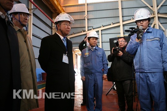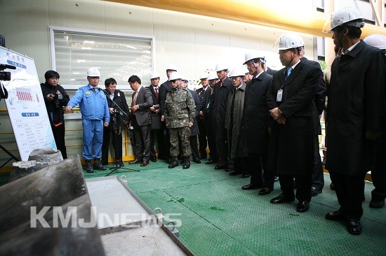 ▲ 포스코 정준양 회장(사진 왼쪽에서 세번째)을 비롯한 주요 인사들이 제련 공정에 대한 설명을 관계자로부터 듣고 있다.