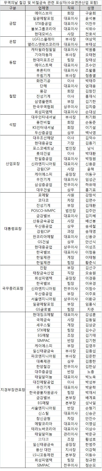 87명에 훈ㆍ포장ㆍ표창 수여 제49회 무역의날 기념식에서 총 87명의 철강 및 비철금속 관련 유공자들에게 훈장과 포장, 표창 등이 시상됐다. 방정환 jhbang@snmnews.com 다른 기사 보기 관련기사 (무역의 날) 현대파워텍 8억불 수출탑 수상 저작권자 © 철강금속신문 무단전재 및 재배포 금지