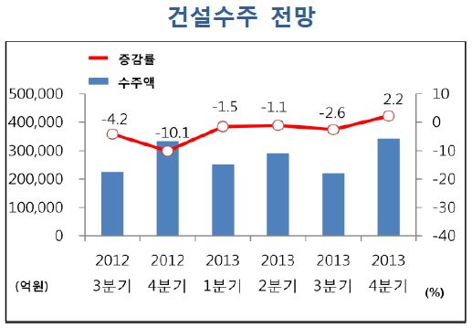 2013년 건축수주는 지방의 주택수주 감소, 대내외 경제 불확실성으로 민간부문 비주거 건축수주 감소가 예상되며 공공부문도 지방이전 공공 기관 및 세종시 청사 착공 물량이 2012년 대비 대규모로 증가하기는 어려울 것으로 전망했다. 또한 포스리는 건축수주의 가장 큰 비중을 차지하는 주택수주가 2011년, 2012년 호조세를 보이면서 주택시장이 회복국면에 진입할 가능성이 있으나 지방을 중심으로 나타난 주택건설경기의 회 복세가 2013년까지 지속될 것인지 여부와 수도권 주택건설 경기로의 확대가능성을 예의주실 할 필요가 있다고 설명했다.