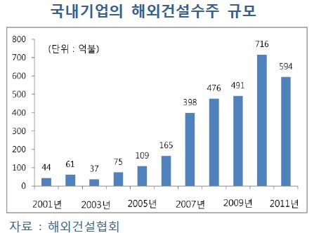 해외건설수주는 2010년 UAE 원전건설 사업 수주로 716억 달러의 역대 최대 실적을 달성한 이후 유가상승으로 중동지역 재정수입이 풍부해지면서 플랜트와 인프라 수주가 지속적 으로 증가하고 있다. 이에 따라 포스리는 2013년 또한 남미, 중동/아프리카, 아시 아 지역을 중심으로 산업화, 도시화에 따른 대규모의 건설투자로 전년 동기 대비 10% 이상의 성장을 예상했다.