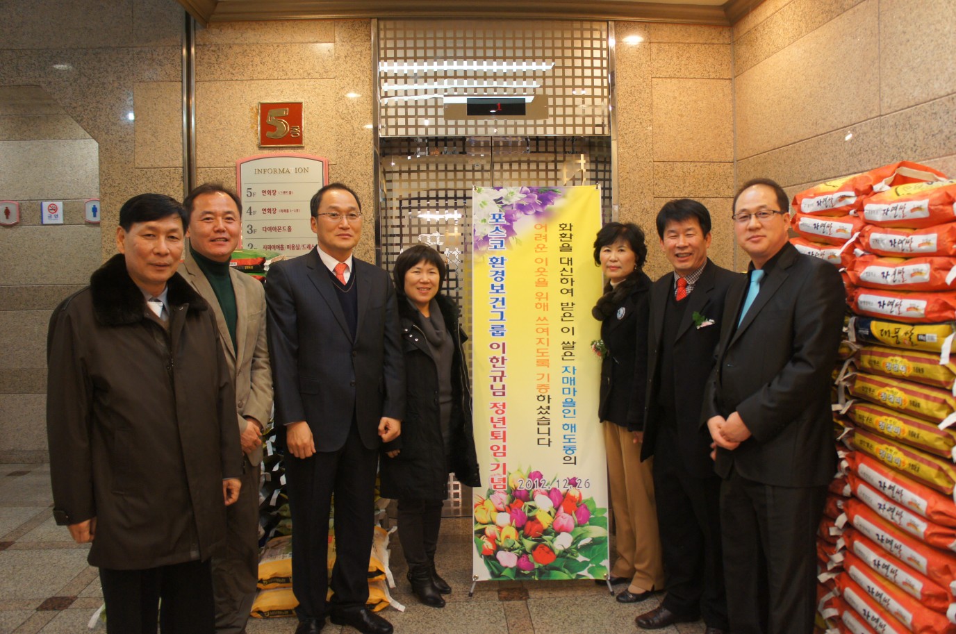 주인공은 포항제철소 환경보건그룹에서 정년퇴직 하는 이한규 씨. 그는 지난 26일에 정년퇴직을 기념하는 자리를 찾은 회사동료와 지인들로부터 축하화환이나 선물 대신 받은 쌀화환을 받아 모인 쌀 200여포를 자매마을 해도동의 어려운 이웃들을 위해 기증했다.