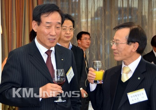 ▲ 본지 송재봉 사장(겸 편집인)이 이운형 세아제강 회장(좌)과 이야기를 나누고 있다.