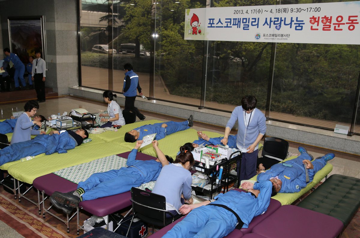 헌혈장소는 포항제철소 생산관제센터 1층, 포스코 본사 1층 로비와 함께 지곡동 한마당체육관 주차장 등 세 곳에 마련해 포스코패밀리 임직원 및 가족은 물론 일반 시민들도 참여할 수 있도록 했다.