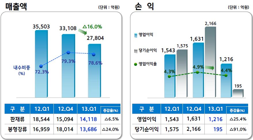 1분기 판재류 매출은 1조4,118억원, 봉형강류는 1조3,686억원에 그치며 지난해 4분기 대비 각각 6.5%, 24% 줄었다. 전체 매출액은 16% 감소했다.