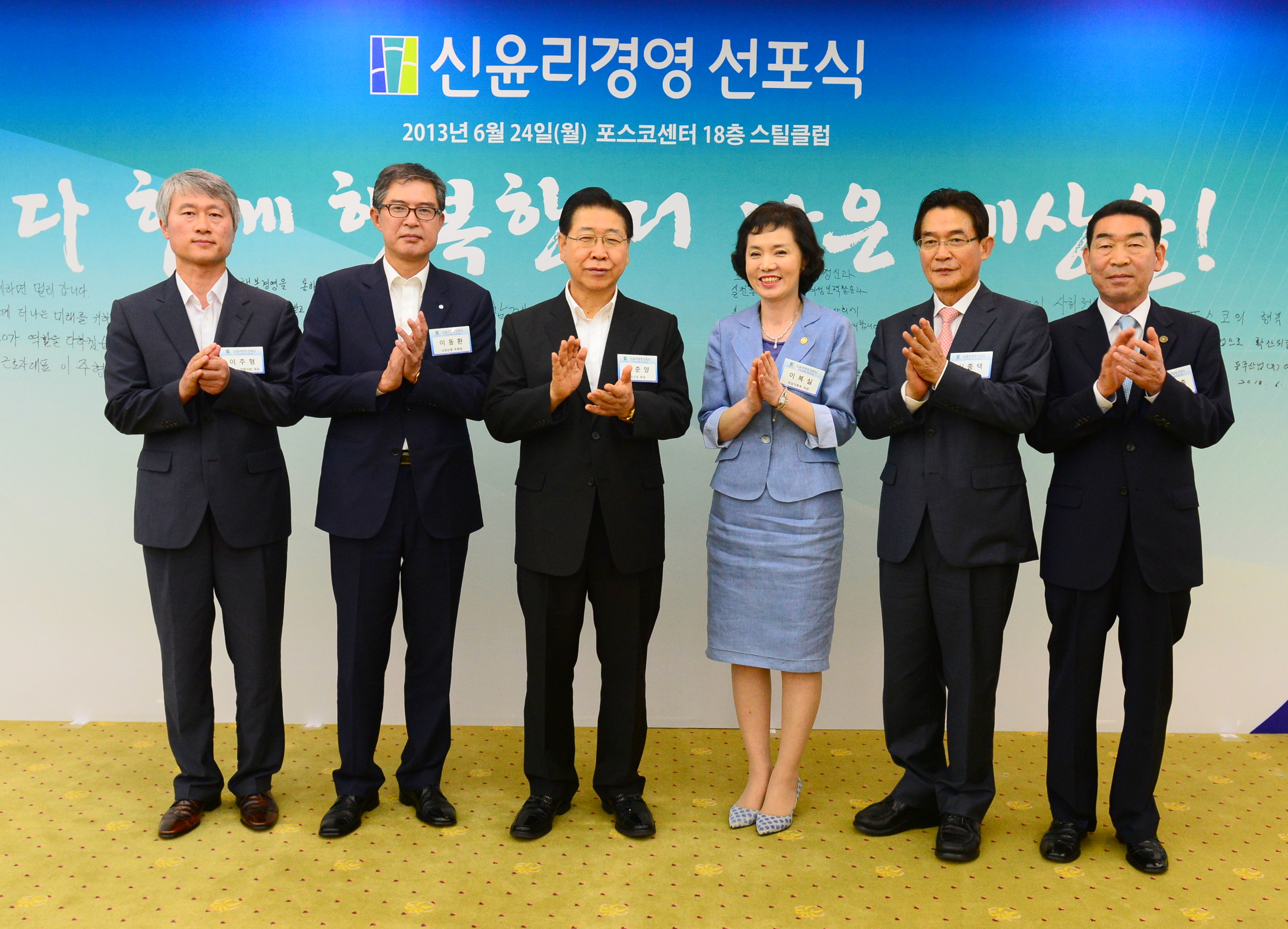 ▲ 정준양 포스코 회장이 신윤리경영 모델과 전략이 담긴 선언문을 발표한 뒤 참석자들과 박수를 치고 있다.(사진 왼쪽부터) 이주형 포스코 노경협의회 대표, 이동환 신한은행 부행장, 정준양 포스코 회장, 이복실 여성가족부 차관, 신종택 세운철강 대표, 나채홍 동주산업 회장