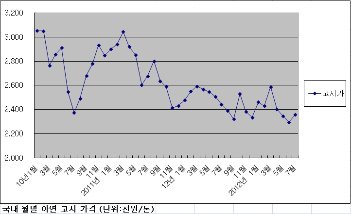 고려아연, 영풍 등 국내 대형 아연생산업체들은 7월 국내 아연 판매 가격을 전월 (229만7,000원)대비 톤당 6만3,000원(2.7%상승) 인상한 톤당 236만원으로 결정했다고 1일 밝혔다.