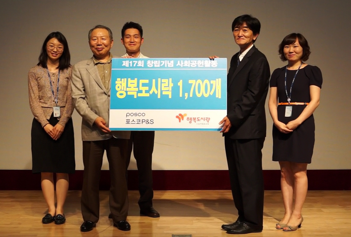 지난 5일 진행된 창립기념행사에서 포스코P&S는 임직원이 한 뜻을 모아 이웃사랑을 실천하자는 취지로 소외계층에 무료급식을 제공하는 ‘행복도시락’ 1,700개를 기증했다.