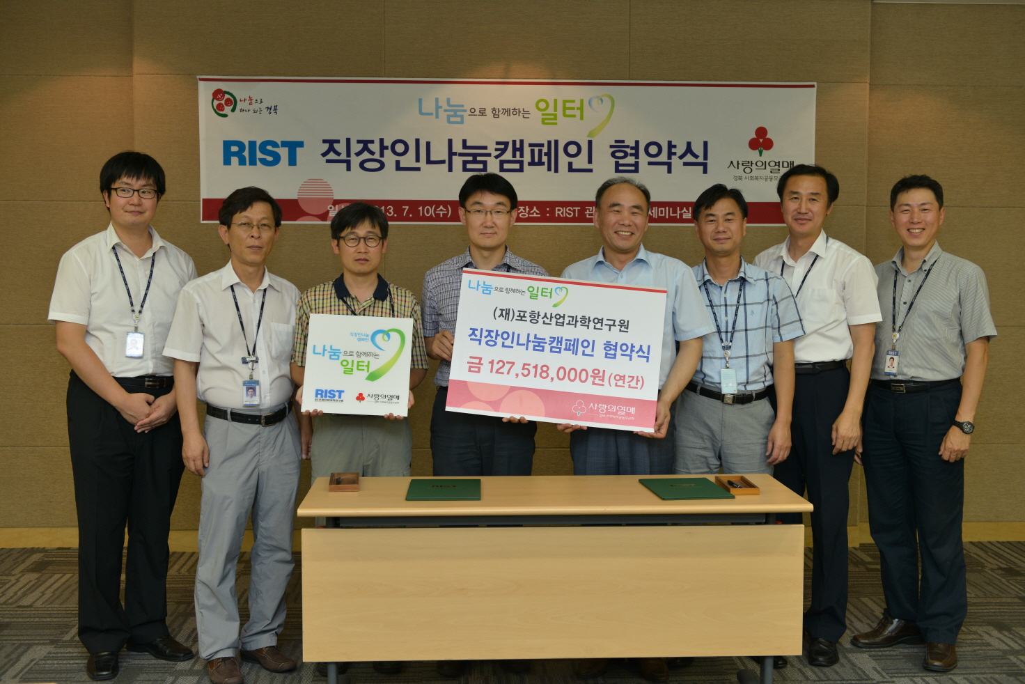 RIST(포항산업과학연구원, 원장 주웅용)가 경북사회복지공동모금회(회장 이대공)와 10일 오후 포항 RIST 본관 세미나실에서 매월 급여의 일정액을 기부하는 '직장인 나눔캠페인' 협약식을 가졌다.