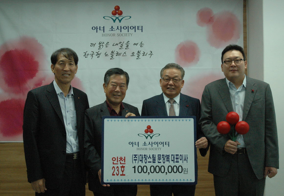 대창스틸의 문창복 회장이 인천사회복지공동모금회의 고액기부자 모임인 ‘아너 소사이어티’의 23번째(전국 324호) 회원으로 가입했다.