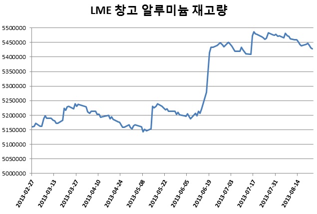 LME 알루미늄 창고 재고량은 증가를 지속하다 8월 들어 감소세를 보이면서 4개월 만에 감소세로 전환하는 모습이다. 지난 7월 LME 알루미늄 창고 평균 재고량은 545만1,470톤을 기록해 6월 530만7,441톤, 5월 519만5,383톤, 4월 518만9,860톤에 이어 증가세를 이어 왔다. 8월 23일까지의 평균 알루미늄 재고량 역시 545만5,472톤으로 7월보다 높은 수준을 보이고 있기는 하지만, 8월 첫째 주 평균은 547만180톤, 둘째 주 평균은 545만725톤, 셋째 주 평균은 543만8,105톤을 기록해 평균 재고량 감소세가 뚜렷하다.