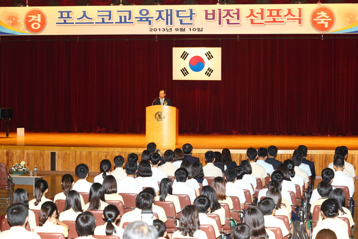 포스코교육재단은 지난 5월부터 세계적인 컨설팅그룹인 보스턴컨설팅 그룹(BCG)과 함께 새로운 비전 정립 프로젝트를 추진하고 9월 10일 오후 4시 포항 소재 재단 체육관에서 박한용 이사장, 교직원, 학생, 학부모 300여 명이 참석한 가운데 비전 선포식을 가졌다.
