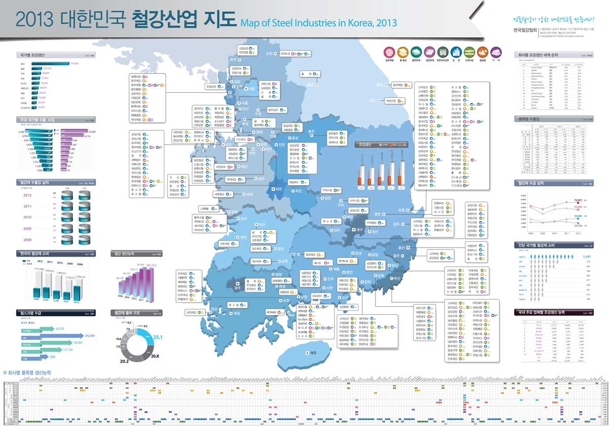 이번에 제작된 2013년판 철강산업 지도에는 국내에서 1만톤 이상의 철강제품을 생산하는 220개 철강사의 위치와, 회사별ㆍ품목별 생산능력을 쉽게 볼 수 있다.