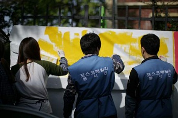 10월19일 마산 산호초등학교에서는 포스코특수강의 사회봉사 프로그램 중 하나인 ‘학교 담장 갤러리 가꾸기’마지막 활동이 펼쳐졌다.