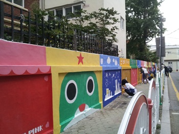 특히 이날 봉사활동은 창동 예술촌 작가들의 재능기부를 통해 아이들에게 꿈과 희망을 심어주는 멋진 그림과 산호초등학교 학생들이 직접 참여하여 제작한 점토 타일을 부착하여 의미를 더했다.
